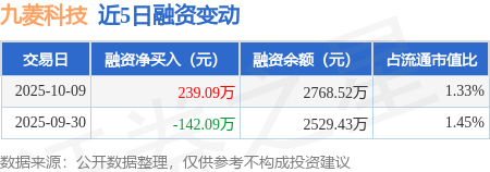 证券之星消息,10月9日,九菱科技(920505)融资买入799.96万元,融资偿还560.87万元,融资净买入239.09万元,融资余额2768.52万元。