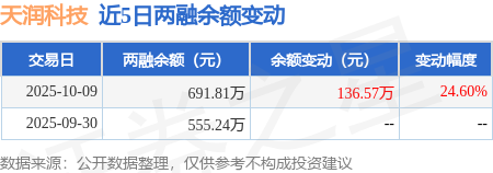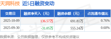 证券之星消息,10月9日,天润科技(920564)融资买入164.85万元,融资偿还28.27万元,融资净买入136.57万元,融资余额691.81万元。