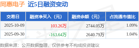 证券之星消息,10月9日,同惠电子(920509)融资买入474.31万元,融资偿还371.05万元,融资净买入103.26万元,融资余额2744.05万元。