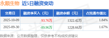 证券之星消息,10月9日,永顺生物(920729)融资买入137.09万元,融资偿还43.33万元,融资净买入93.76万元,融资余额1322.42万元。