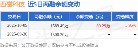 证券之星消息,10月9日,西磁科技(920061)融资买入271.25万元,融资偿还181.96万元,融资净买入89.29万元,融资余额1589.49万元。