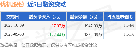 证券之星消息,10月9日,优机股份(920943)融资买入202.29万元,融资偿还114.32万元,融资净买入87.97万元,融资余额1947.03万元。