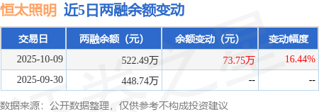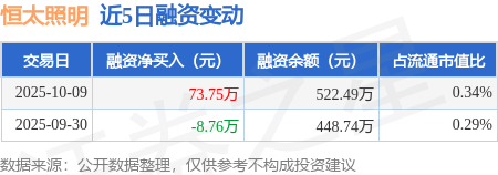 证券之星消息,10月9日,恒太照明(920339)融资买入81.35万元,融资偿还7.6万元,融资净买入73.75万元,融资余额522.49万元。