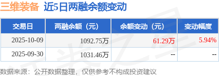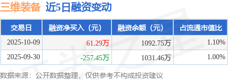 证券之星消息,10月9日,三维装备(920834)融资买入197.67万元,融资偿还136.38万元,融资净买入61.29万元,融资余额1092.75万元。