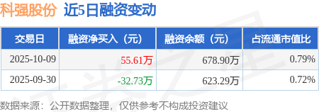 证券之星消息,10月9日,科强股份(920665)融资买入70.6万元,融资偿还14.99万元,融资净买入55.61万元,融资余额678.9万元。