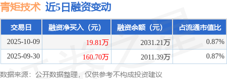 证券之星消息,10月9日,青矩技术(920208)融资买入114.09万元,融资偿还94.27万元,融资净买入19.81万元,融资余额2031.21万元。