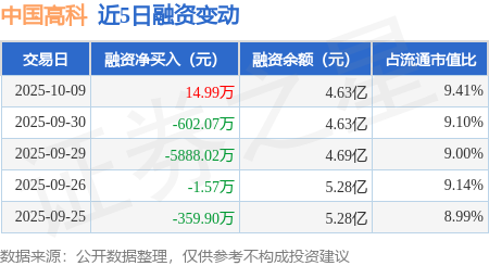 证券之星消息,10月9日,中国高科(600730)融资买入2472.58万元,融资偿还2457.59万元,融资净买入14.99万元,融资余额4.63亿元。