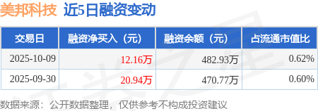 证券之星消息,10月9日,美邦科技(920471)融资买入31.59万元,融资偿还19.43万元,融资净买入12.16万元,融资余额482.93万元。