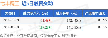 证券之星消息,10月9日,七丰精工(920169)融资买入95.64万元,融资偿还84.14万元,融资净买入11.49万元,融资余额1428.45万元。