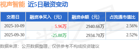 证券之星消息,10月9日,视声智能(920976)融资买入25.43万元,融资偿还19.47万元,融资净买入5.96万元,融资余额2940.66万元。