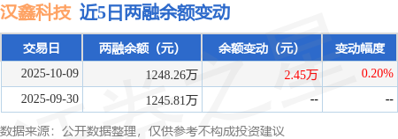 证券之星消息,10月9日,汉鑫科技(920092)融资买入75.92万元,融资偿还73.46万元,融资净买入2.45万元,融资余额1248.26万元。