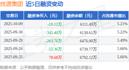 证券之星消息,10月9日,技源集团(603262)融资买入283.7万元,融资偿还302.81万元,融资净卖出19.12万元,融资余额6111.49万元。