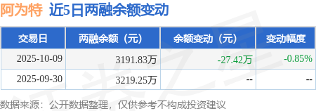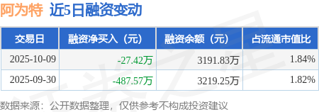 证券之星消息,10月9日,阿为特(920693)融资买入327.85万元,融资偿还355.27万元,融资净卖出27.42万元,融资余额3191.83万元。