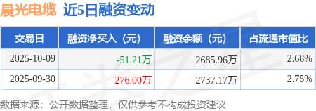 证券之星消息,10月9日,晨光电缆(920639)融资买入7.87万元,融资偿还59.08万元,融资净卖出51.21万元,融资余额2685.96万元。