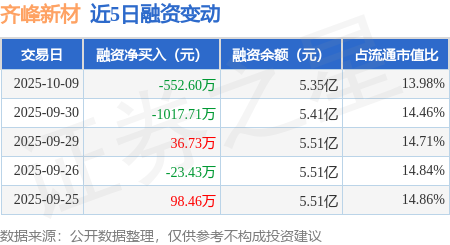 证券之星消息,10月9日,齐峰新材(002521)融资买入1006.99万元,融资偿还1559.59万元,融资净卖出552.6万元,融资余额5.35亿元。