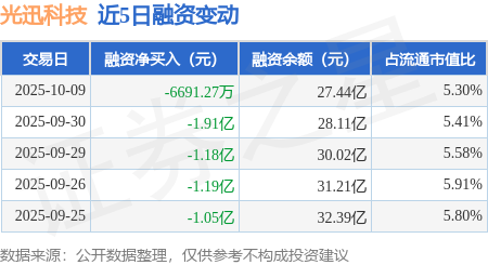 证券之星消息,10月9日,光迅科技(002281)融资买入3.74亿元,融资偿还4.41亿元,融资净卖出6691.27万元,融资余额27.44亿元。