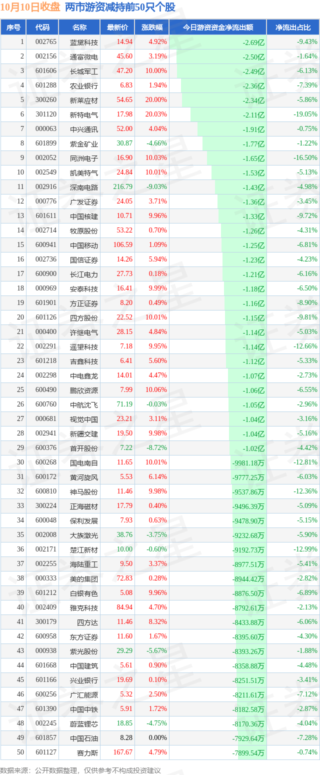 两市游资减持最多的前十只个股为: