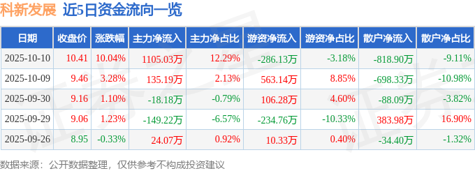证券之星消息,截至2025年10月10日收盘,科新发展(600234)报收于10.41元,上涨10.04%,涨停,换手率3.37%,成交量8.85万手,成交额8991.63万元。