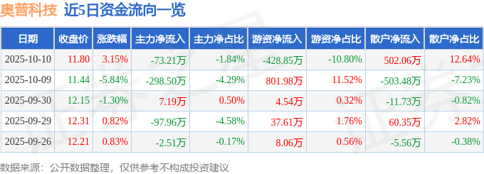 10月10日的资金流向数据方面,主力资金净流出73.21万元,占总成交额1.84%,游资资金净流出428.85万元,占总成交额10.8%,散户资金净流入502.06万元,占总成交额12.64%。