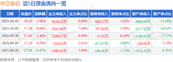 证券之星消息,截至2025年10月10日收盘,华立股份(603038)报收于18.1元,上涨2.96%,换手率5.78%,成交量15.52万手,成交额2.77亿元。