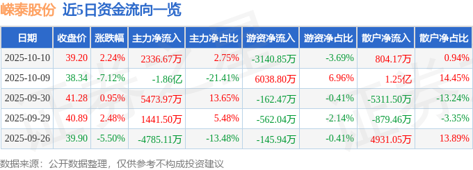 10月10日的资金流向数据方面,主力资金净流入2336.67万元,占总成交额2.75%,游资资金净流出3140.85万元,占总成交额3.69%,散户资金净流入804.17万元,占总成交额0.94%。