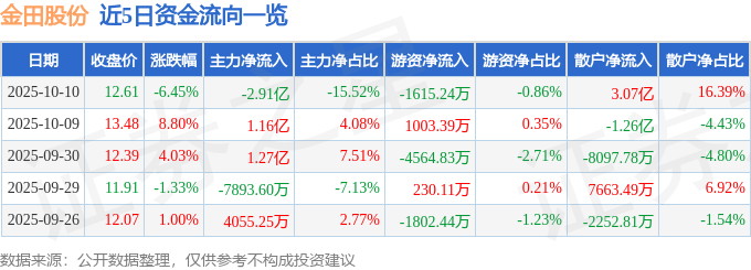 10月10日的资金流向数据方面,主力资金净流出2.91亿元,占总成交额15.52%,游资资金净流出1615.24万元,占总成交额0.86%,散户资金净流入3.07亿元,占总成交额16.39%。