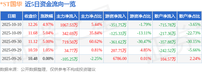 证券之星消息,截至2025年10月10日收盘,*ST国华(000004)报收于12.26元,上涨4.97%,换手率12.87%,成交量16.26万手,成交额1.96亿元。
