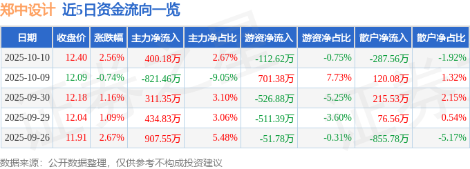 10月10日的资金流向数据方面,主力资金净流入400.18万元,占总成交额2.67%,游资资金净流出112.62万元,占总成交额0.75%,散户资金净流出287.56万元,占总成交额1.92%。