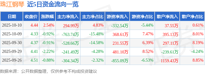 证券之星消息,截至2025年10月10日收盘,珠江钢琴(002678)报收于4.44元,上涨2.54%,换手率1.02%,成交量13.89万手,成交额6113.62万元。