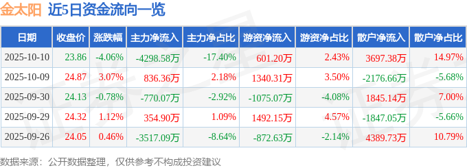 证券之星消息,截至2025年10月10日收盘,金太阳(300606)报收于23.86元,下跌4.06%,换手率8.7%,成交量10.23万手,成交额2.47亿元。