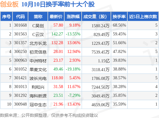 当日创业板换手率前10大个股中7只个股收涨,平均涨幅9.81%,其中C昊创(301668)以换手率68.56%排第一,7只个股近5个交易日中多次上榜。