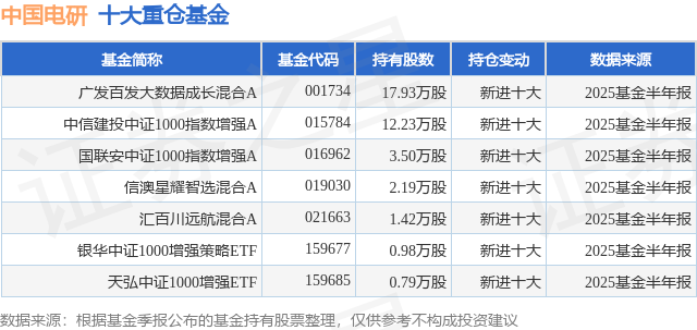 根据2025基金半年报公募基金重仓股数据,重仓该股的公募基金共7家,其中持有数量最多的公募基金为广发基金的广发百发大数据成长混合A。广发百发大数据成长混合A目前规模为4.08亿元,最新净值1.679(10月9日),较上一交易日上涨0.48%,近一年上涨36.28%。该公募基金现任基金经理为叶帅。叶帅在任的基金产品包括:广发估值优势混合A,管理时间为2025年3月6日至今,期间收益率为21.66%;广发北交所精选两年定开混合A,管理时间为2025年7月24日至今,期间收益率为8.22%;广发诚享混合A,管理时间为2025年10月1日至今,期间收益率为0.0%。