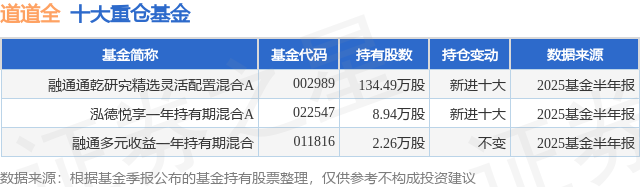 根据2025基金半年报公募基金重仓股数据,重仓该股的公募基金共3家,其中持有数量最多的公募基金为融通基金的融通通乾研究精选灵活配置混合A。融通通乾研究精选灵活配置混合A目前规模为3.03亿元,最新净值1.1893(10月9日),较上一交易日上涨0.58%,近一年上涨26.0%。该公募基金现任基金经理为石础。石础在任的基金产品包括:融通多元收益一年持有期混合,管理时间为2025年2月28日至今,期间收益率为4.87%。
