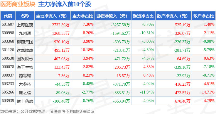 从资金流向上来看,当日医药商业板块主力资金净流出1.61亿元,游资资金净流出5311.8万元,散户资金净流入2.14亿元。医药商业板块个股资金流向见下表: