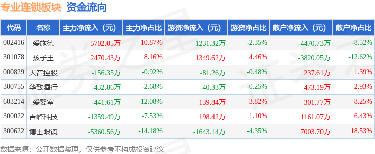 从资金流向上来看,当日专业连锁板块主力资金净流入421.6万元,游资资金净流出1308.15万元,散户资金净流入886.55万元。专业连锁板块个股资金流向见下表: