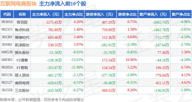 从资金流向上来看,当日互联网电商板块主力资金净流出1.59亿元,游资资金净流入4879.32万元,散户资金净流入1.1亿元。互联网电商板块个股资金流向见下表: