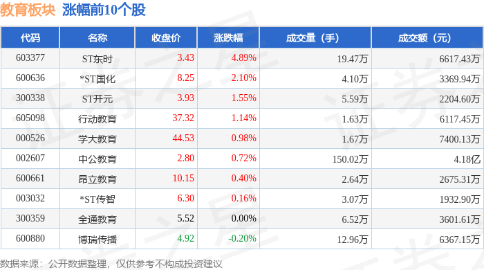 证券之星消息,10月10日教育板块较上一交易日下跌0.59%,豆神教育领跌。当日上证指数报收于3897.03,下跌0.94%。深证成指报收于13355.42,下跌2.7%。教育板块个股涨跌见下表: