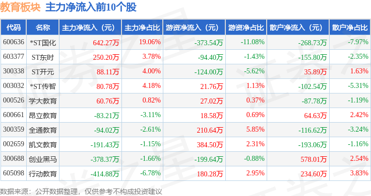从资金流向上来看,当日教育板块主力资金净流出2.81亿元,游资资金净流入1.04亿元,散户资金净流入1.76亿元。教育板块个股资金流向见下表: