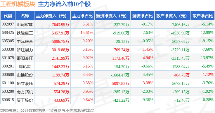 从资金流向上来看,当日工程机械板块主力资金净流出1.62亿元,游资资金净流入1.57亿元,散户资金净流入538.91万元。工程机械板块个股资金流向见下表: