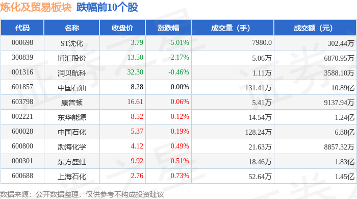 证券之星消息,10月10日炼化及贸易板块较上一交易日上涨0.4%,岳阳兴长领涨。当日上证指数报收于3897.03,下跌0.94%。深证成指报收于13355.42,下跌2.7%。炼化及贸易板块个股涨跌见下表: