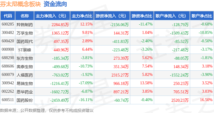 从资金流向上来看,当日芬太尼概念板块主力资金净流出2138.39万元,游资资金净流入2095.61万元,散户资金净流入42.79万元。芬太尼概念板块个股资金流向见下表: