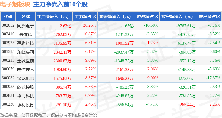 从资金流向上来看,当日电子烟板块主力资金净流出83.96亿元,游资资金净流入23.01亿元,散户资金净流入60.94亿元。电子烟板块个股资金流向见下表: