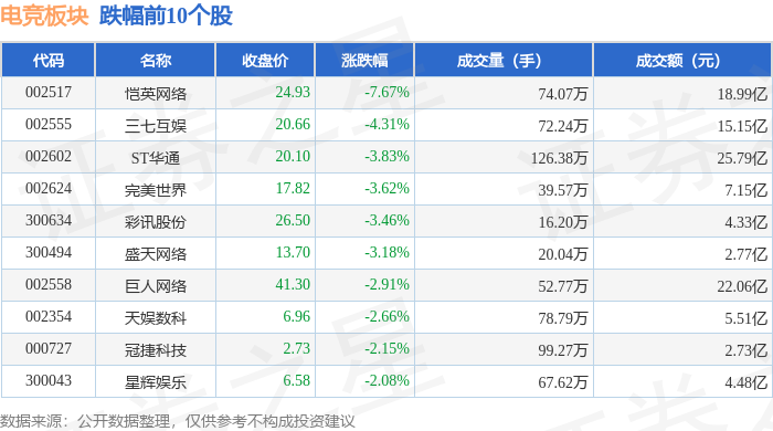 证券之星消息,10月10日电竞板块较上一交易日下跌2.9%,恺英网络领跌。当日上证指数报收于3897.03,下跌0.94%。深证成指报收于13355.42,下跌2.7%。电竞板块个股涨跌见下表: