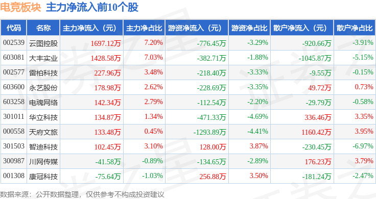 从资金流向上来看,当日电竞板块主力资金净流出18.01亿元,游资资金净流入2.47亿元,散户资金净流入15.54亿元。电竞板块个股资金流向见下表:
