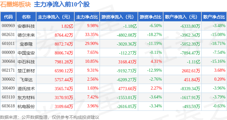 从资金流向上来看,当日石墨烯板块主力资金净流出27.62亿元,游资资金净流入6.5亿元,散户资金净流入21.12亿元。石墨烯板块个股资金流向见下表:
