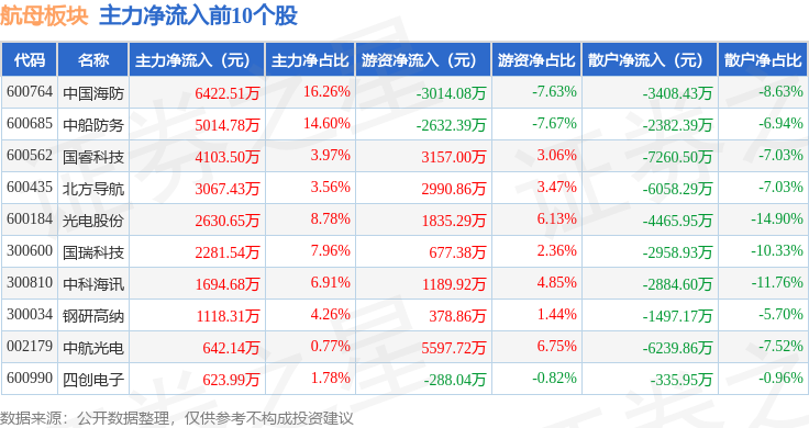 从资金流向上来看,当日航母板块主力资金净流出5.8亿元,游资资金净流入9670.53万元,散户资金净流入4.83亿元。航母板块个股资金流向见下表: