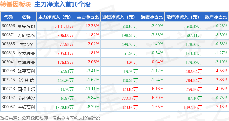 从资金流向上来看,当日转基因板块主力资金净流出4556.58万元,游资资金净流出4347.7万元,散户资金净流入8904.28万元。转基因板块个股资金流向见下表: