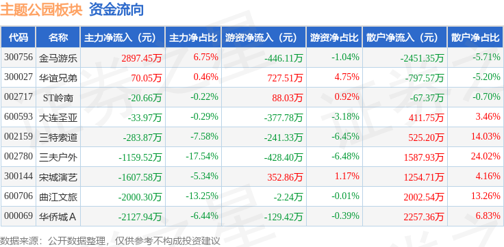 从资金流向上来看,当日主题公园板块主力资金净流出4266.33万元,游资资金净流出456.88万元,散户资金净流入4723.21万元。主题公园板块个股资金流向见下表: