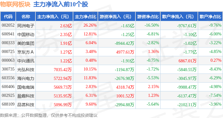 从资金流向上来看,当日物联网板块主力资金净流出153.33亿元,游资资金净流入47.15亿元,散户资金净流入106.17亿元。物联网板块个股资金流向见下表:
