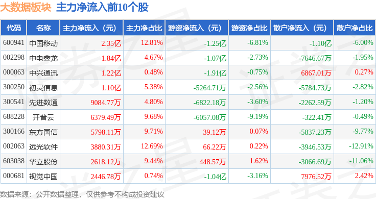 从资金流向上来看,当日大数据板块主力资金净流出165.76亿元,游资资金净流入45.96亿元,散户资金净流入119.79亿元。大数据板块个股资金流向见下表: